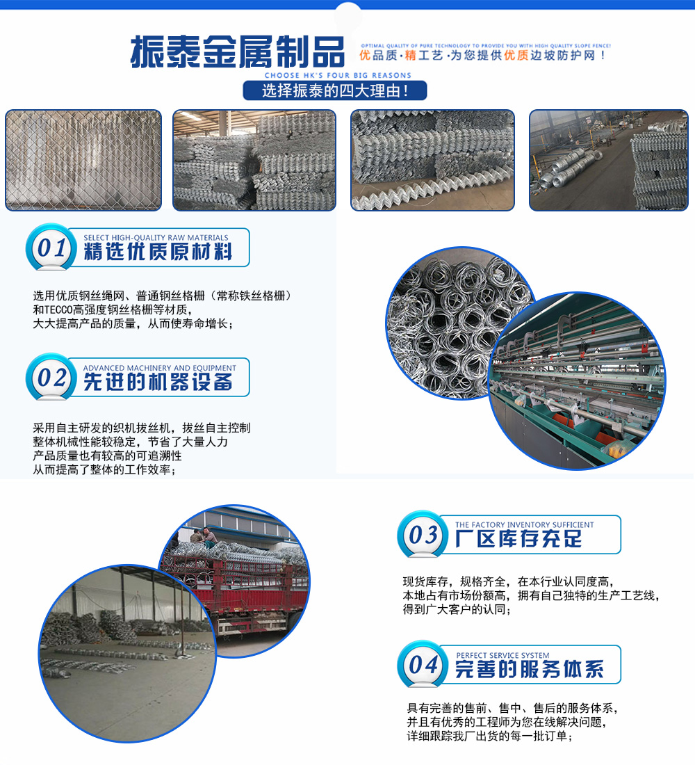深州市振泰金屬制品有限公司緊鄰絲網之鄉—安平,東距(G45)大廣高速10公里,南距(G1811)石黃高速15公里,北距首都北京250公里,京九鐵路從這里鋪地而過,交通十分便利,河北省深州市231省道90公里處(深州市與安平縣交界處南150米路東),是一家集生產,加工,銷售為一體的專業防護網廠家。 我廠經過多年的研究創新,產品不斷推陳出新,堅持技術創新、科學管理、誠信經營,注重引進先進的生產技術設備,推行標準化生產,從原材料采購、生產管理、產品檢測等關鍵環節嚴格把關,確保了產品質量,贏得了客戶的信賴。